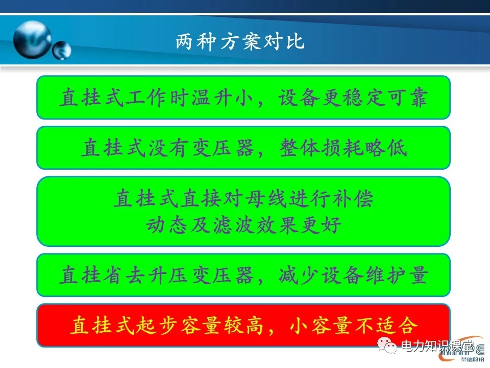 响应速度快(1ms-10ms)不引起电网谐振 | 响应速度慢(40ms~60ms)需要考虑电网谐振问题 |
