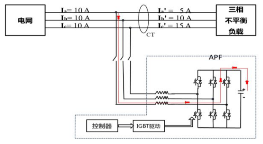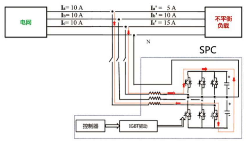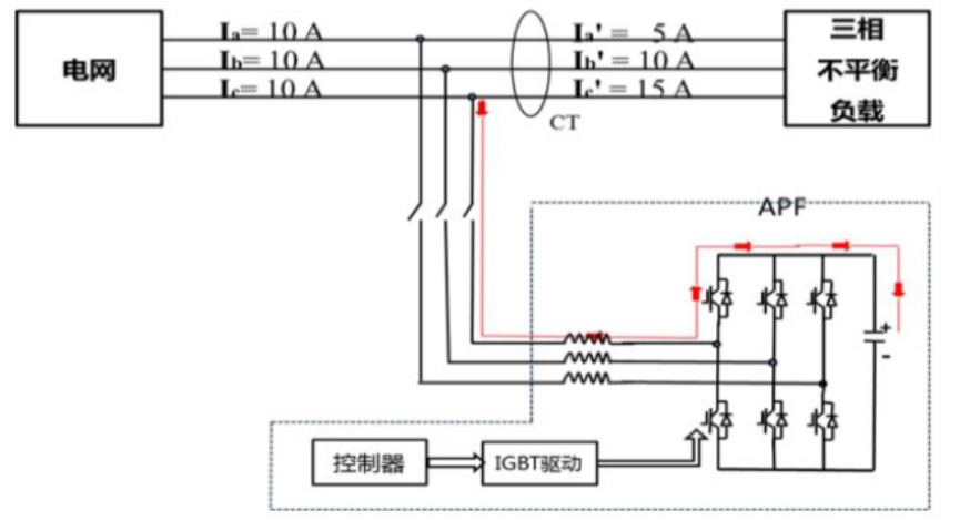 SVG开启后,通过外接电流互感器(CT)实时检测系统电流,并将系统电流信息发送给内部控制器进行处理分析,以判断系统是否处于不平衡状态,同时计算出达到平衡状态时各相所需转换的电流值,然后将信号发送给内部IGBT并驱动其动作,将不平衡电流从电流大的相转移到电流小的相,最后达到三相平衡状态。
