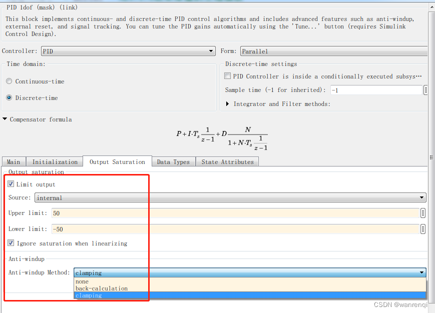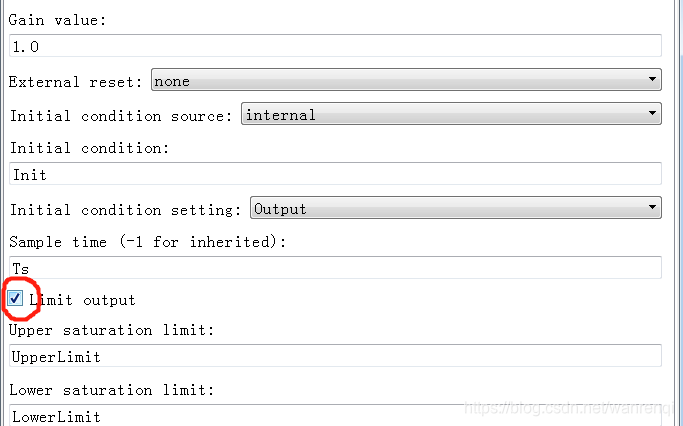 从这个离散的PI控制模块中,可以看出积分环节是带有限幅输出的,当然还要对这个积分模块的限幅进行设置勾选,如图: