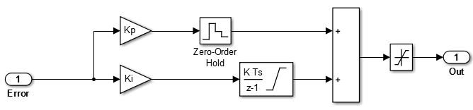 下面搭建一个常用的离散型带输出饱和限制和积分饱和限制的PI控制器。如下: