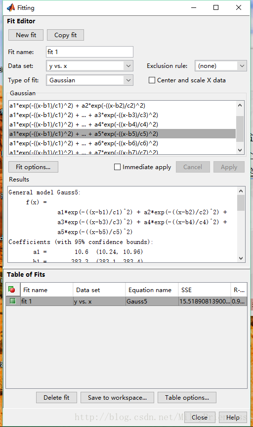 Gaussian:选择不同类型的高斯函数,对应的形式不同,参数不同。可以从第一个开始测试每一个高斯函数,然后看下效果,这里测试到第4个就比较符合了。选择某个高斯函数之后点击apply按钮,即会出现如下效果,fit1即拟合之后的高斯函数对应的线。