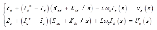 公式中同步旋转角速度由图1中可知,该角速度由PLL(锁相环)提供,且再进行拉普拉斯变换可以得到系统在同步旋转坐标系下并网逆变器领域的数学模型:
