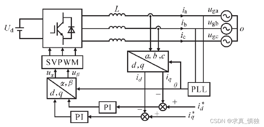 我们可以看到d轴里有q轴的分量,我们想要的是什么呢?没错就是q轴和d轴能独立的控制,Iq和Id代表啥?代表的是有功功率和无功功率,如果能独立控制岂不美哉?我们就能分别指定无功功率输出多少,有功功率输出多少,那么在今年电赛的B题中功率因数可调其实就是调节无功功率,功率因数为1就是无功功率为0,只输出有功功率,你可能要问为什么题目中是整流器,今天讲的是逆变器你能扯上关系,其实无论整流还是逆变,在这个控制系统里面,都是一个控制逻辑,如果逆变器输出电流为你设定的正,那么你设置输出有功电流为为1A那就逆变出去1A,如果你要整流,直流源换成负载,设置电流为-1A,就整流回去了。