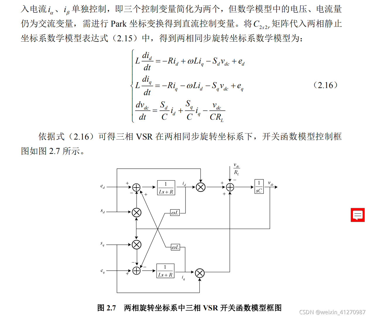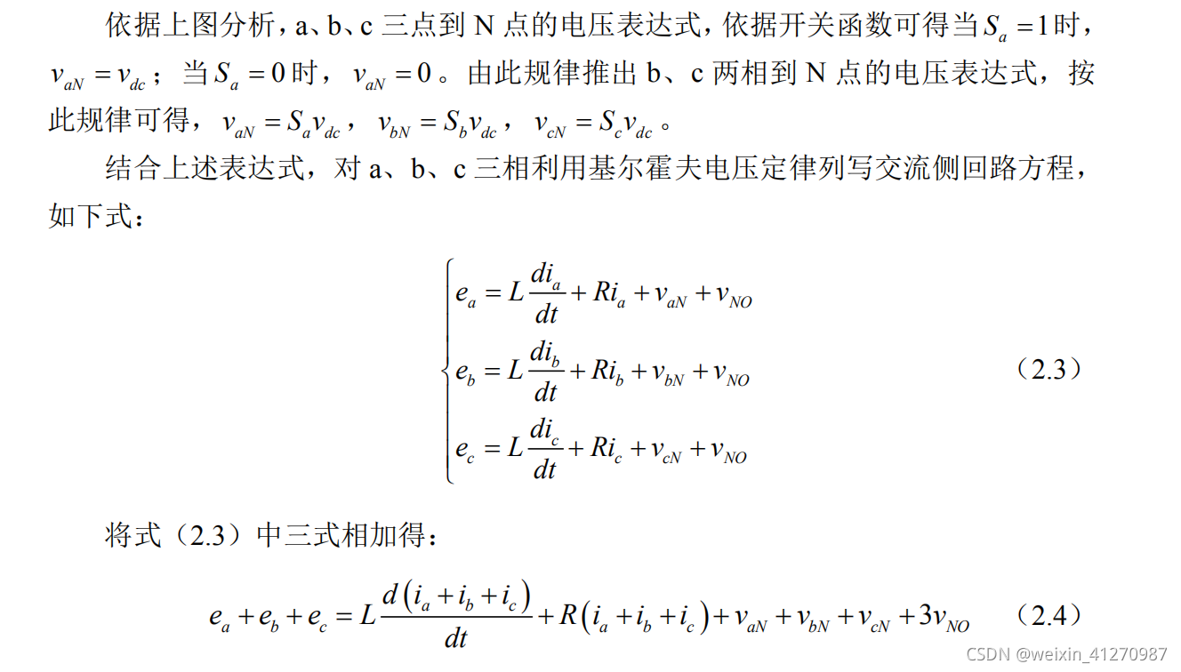 由式2.16依据坐标变换,实现了三相坐标系交流控制变量到两相坐标系直流控制变量的变换,有利于控制系统设计。下一章节,通过电流前馈解耦控制策略,实现交流侧电流有功、无功分量的单独控制。