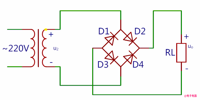 在整流桥的每个工作周期内,同一时间只有两个二极管进行工作,因此我们可以将整流器工作周期分为正半周期和负半周期。