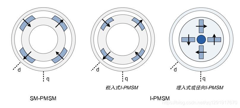 - 内嵌式PMSM(缩写为 I-PMSM),该结构将磁铁嵌入到了转子结构中。