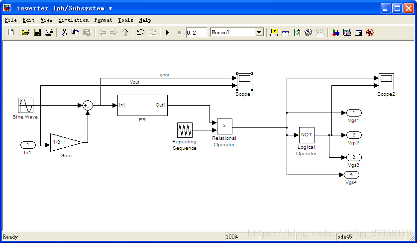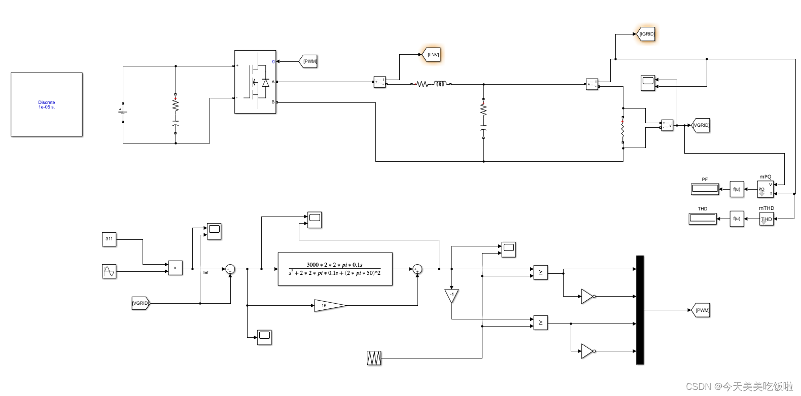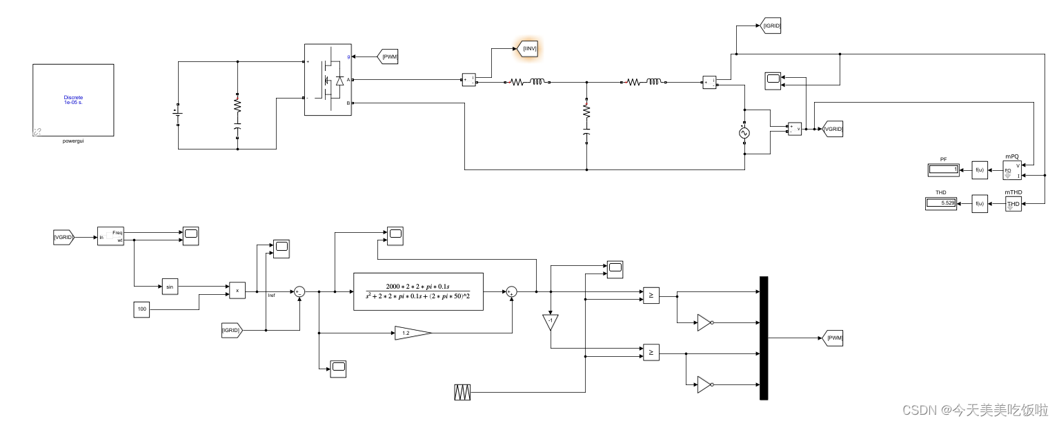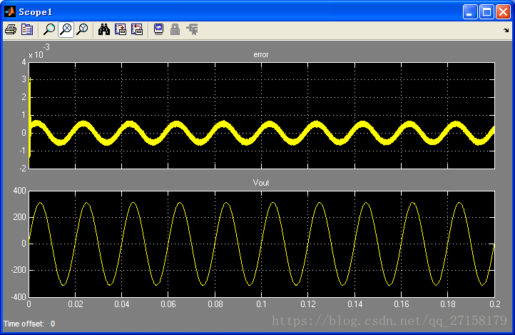 上图中,error = Vref - Vout/311。Vref为频率50Hz、幅值为1的正弦波。Vout是逆变器输出。可以看到闭环系统中误差可降到1mV *311=0.331V之内(1mV为error波形的幅值,311为电压标幺化基准值)。