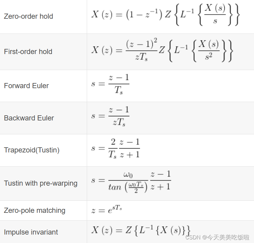 同时Matlab的c2d()函数总共支持五种离散方法。
