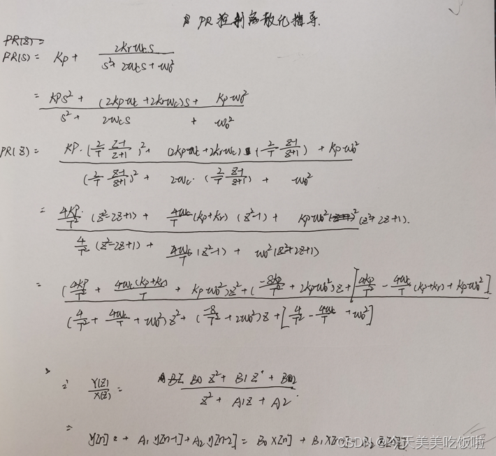 当时学习的时候也有一个疑问,为什么在学习PID控制器的时候没有所谓的离散化步骤。怎么就直接把PID的C语言实现给写出来了呢?是因为PID的连续时域表达式简单,很容易就能推导出离散时域表达式,用的微积分的思想。而在学习PR控制器的时候,是先得到他的传递函数,即s域表达式,可以直接从s域到z域变换。