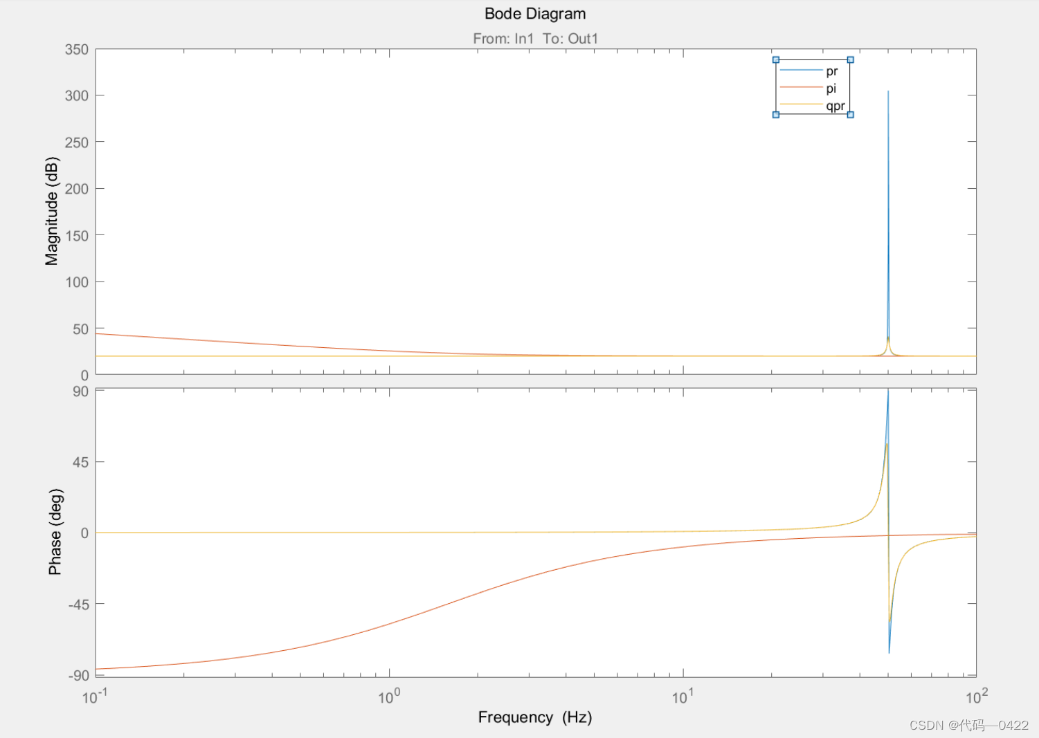 将Bode图中的两条幅频曲线相减,即可得到PR Controller,Bode图中相减即实际增益的相除,即传递函数相除。