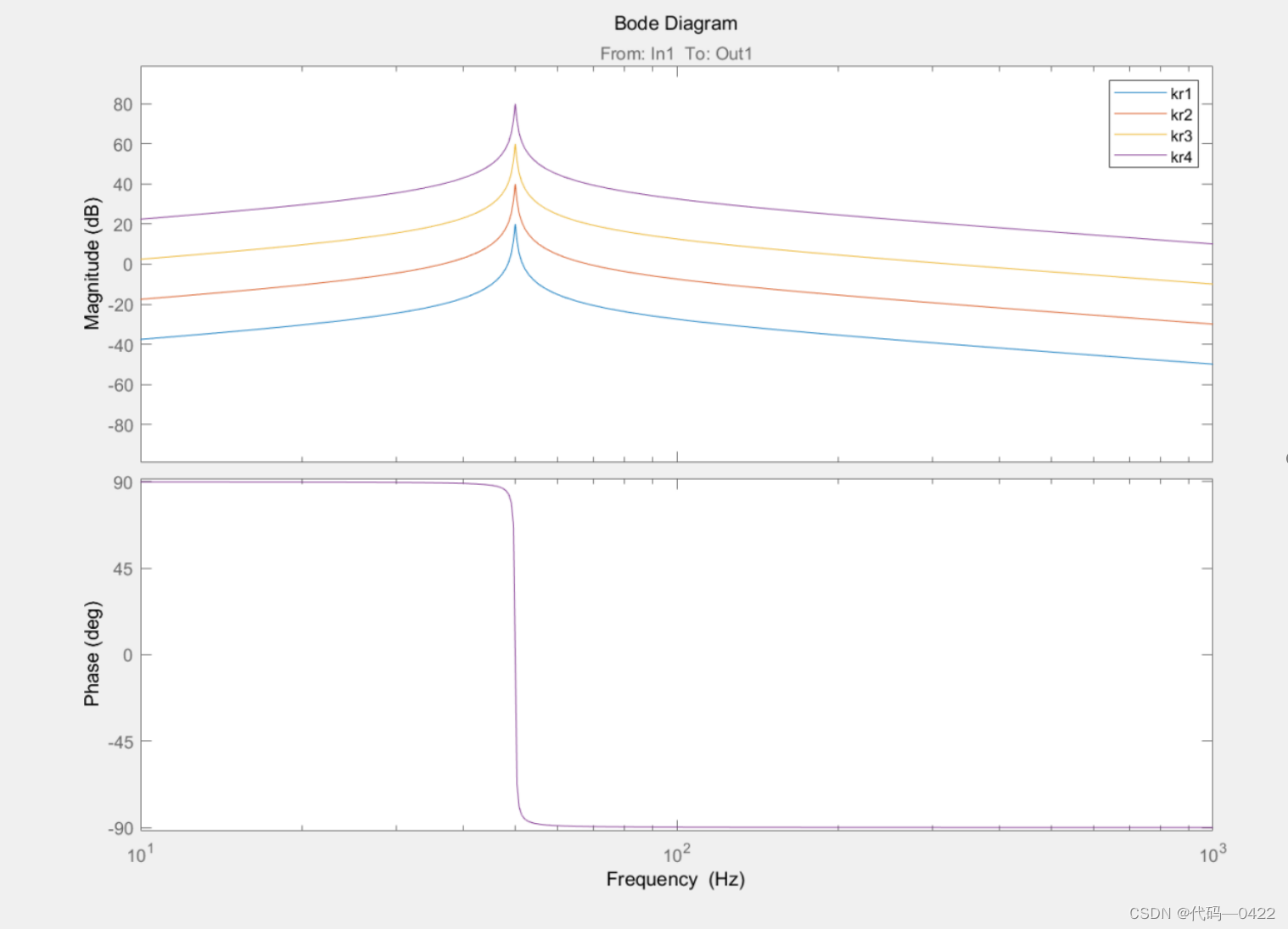 下图是当Kp=1,Kr分别取为1、10、100时理想的PR控制器的波特图(蓝色是Kr=1,绿色是Kr=10,红色是Kr=100)。