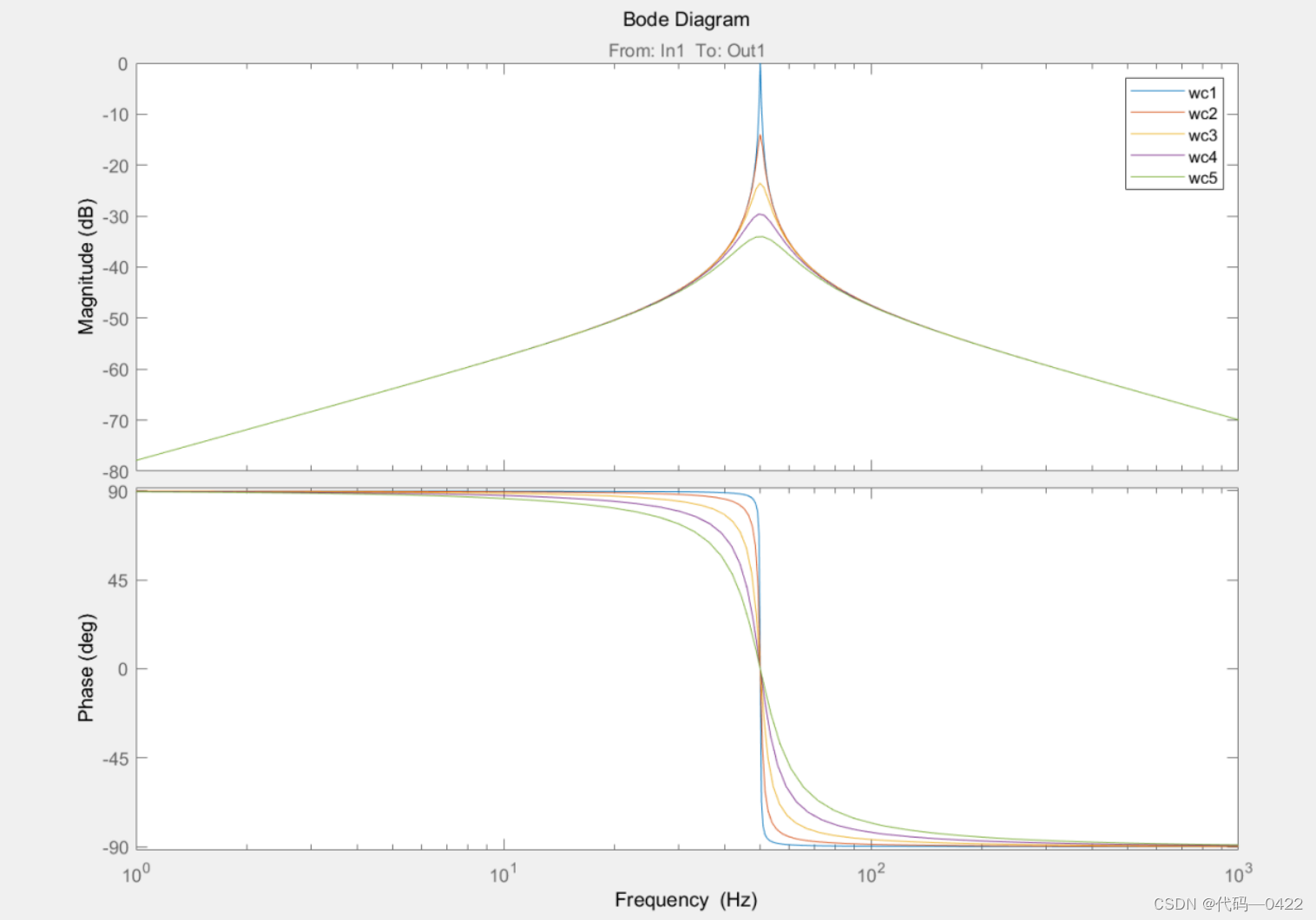 令 Kp=0,Kr=1,ωc 进行不断变化,对应的频率特性如图所示。