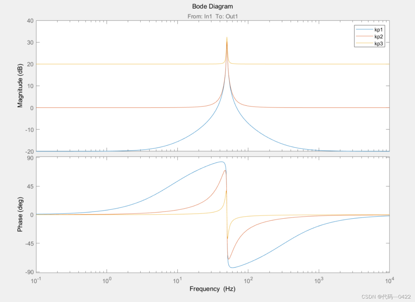 最后令 Kr=100,ωc =3.14,Kp 进行变化,对应的频率特性如图 所示