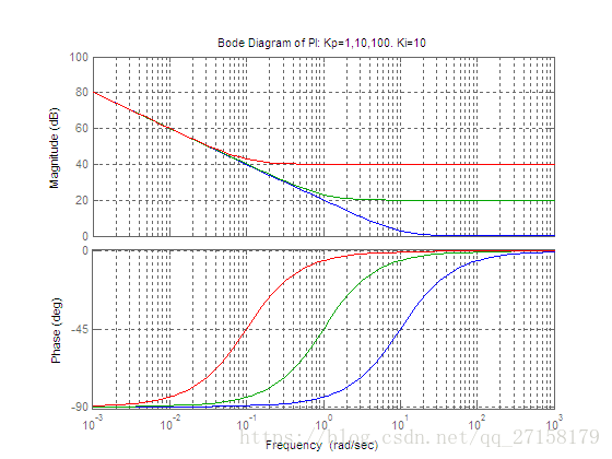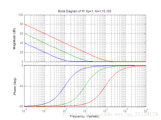 下图是当Kp=1,Ki分别取为1、10、100时PI控制器的波特图(蓝色是Ki=1,绿色是Ki=10,红色是Ki=100)。
