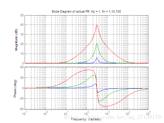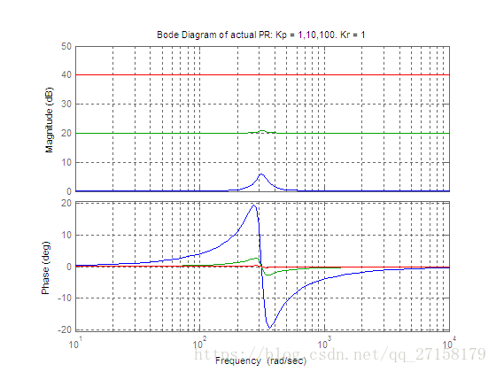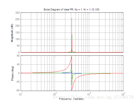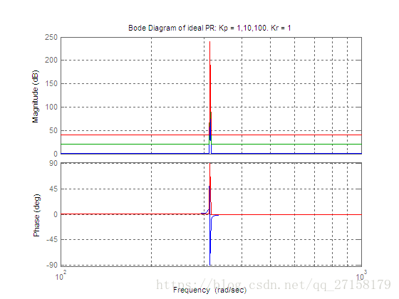 下图是当Kp分别取为1、10、100,Kr=1时理想的PR控制器的波特图(蓝色是Kp=1,绿色是Kp=10,红色是Kp=100)。