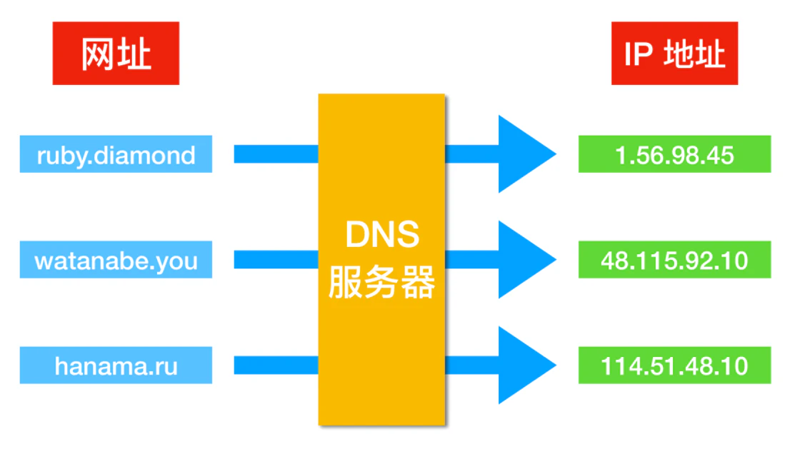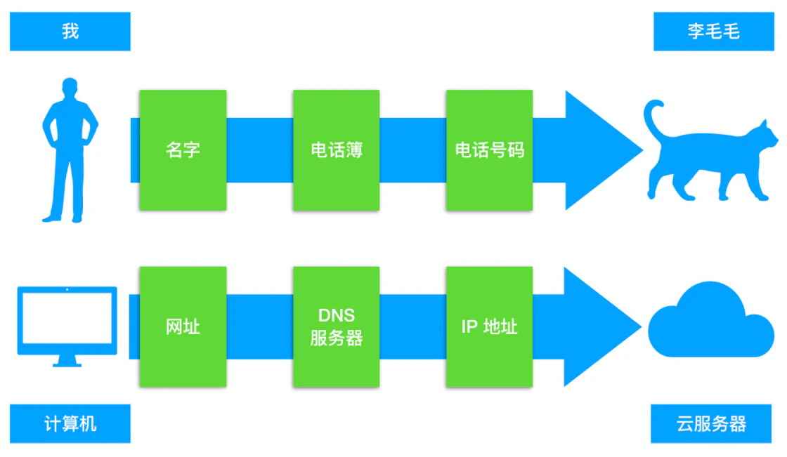 打个比方,我想给一个叫做「李毛毛」的朋友打电话,我没法直接通过「李毛毛」这个名字来打电话。我必须知道李毛毛的电话号码才能打电话。但是他的电话号码太长了,而且我的朋友特别多,我记不住,于是我必须需要电话簿来帮助我,这意味着我只能通过这个电话簿来知道我的朋友们的电话号码。在这个例子里,「李毛毛」这个名字就是服务器的「域名」,「电话号码」就是「IP 地址」,而「电话簿」就是我们今天的主题:「DNS 服务器」。