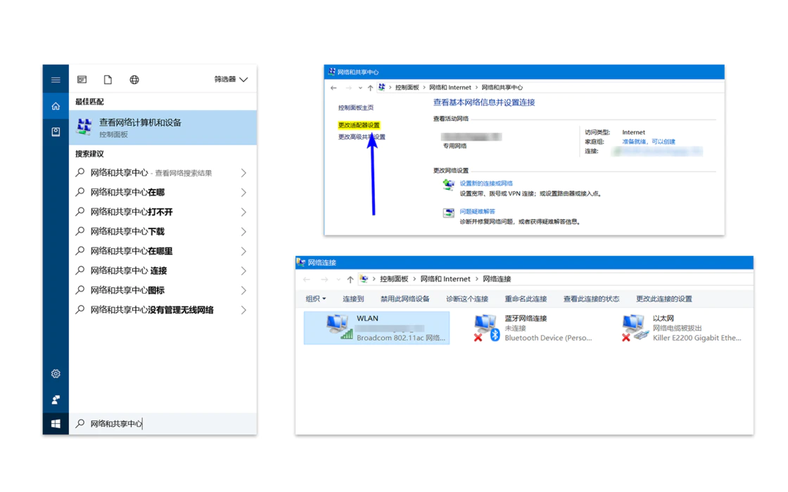 首先,在任务栏搜索「网络和共享中心」,打开第一个选项。