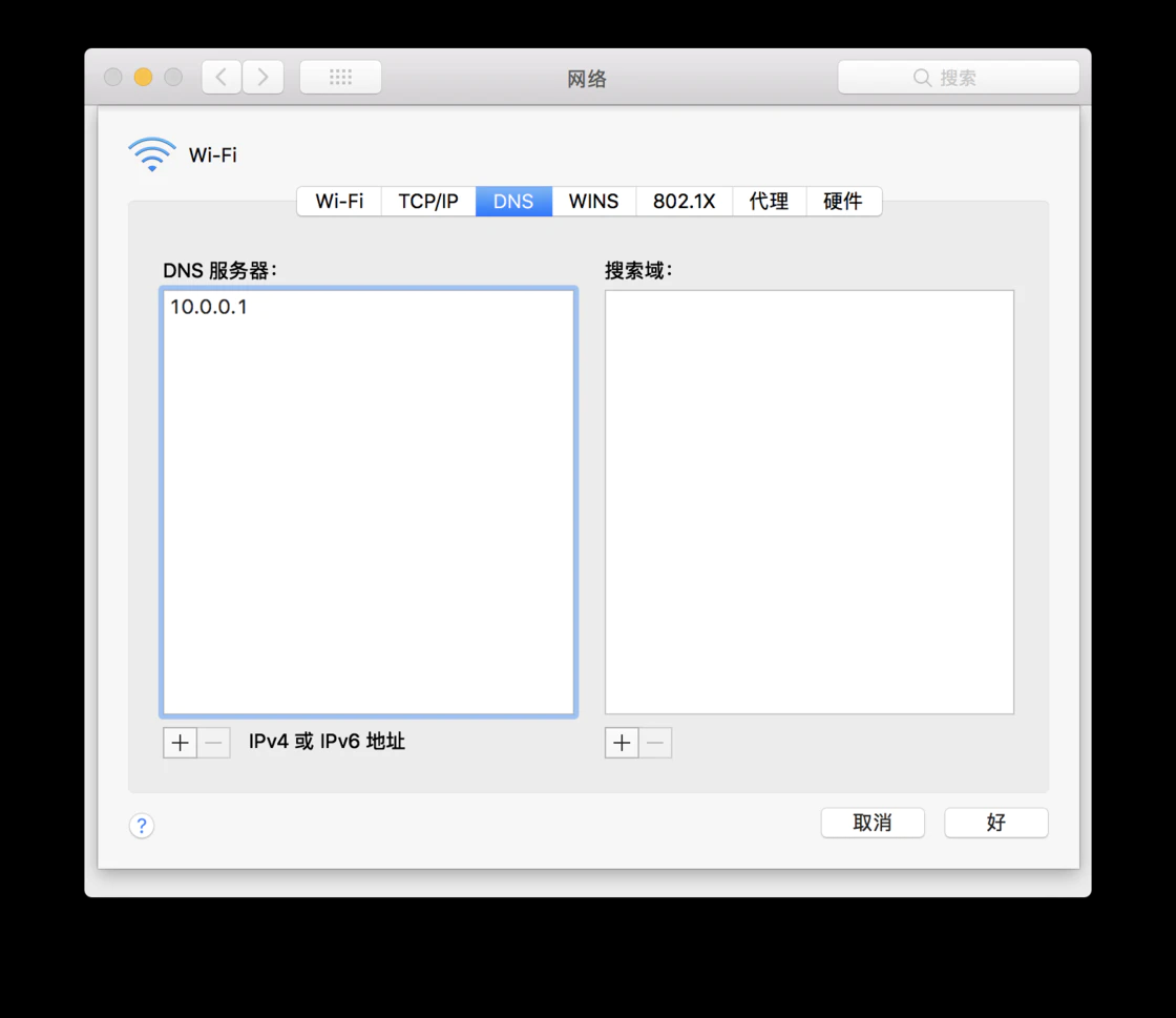 找到「DNS」,点击左侧的「+」来添加 DNS。设置好之后,通过点击「好」来关闭窗口,并应用设置。