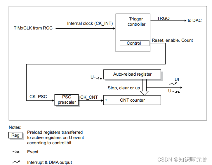 - 触发DAC的同步电路 注:此项是TIM6/7独有功能.
