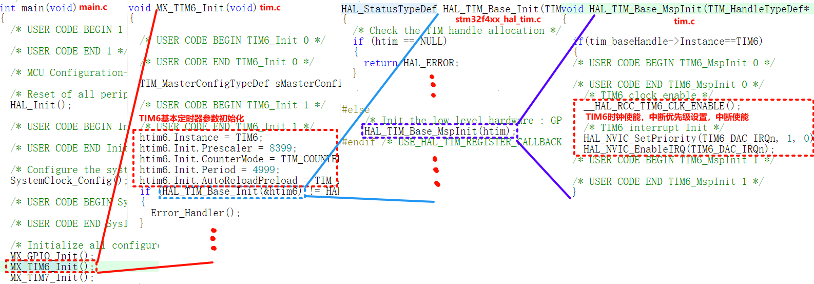 在该MX_TIM6_Init()函数中调用了HAL_TIM_Base_Init()对定时器进行了初始化