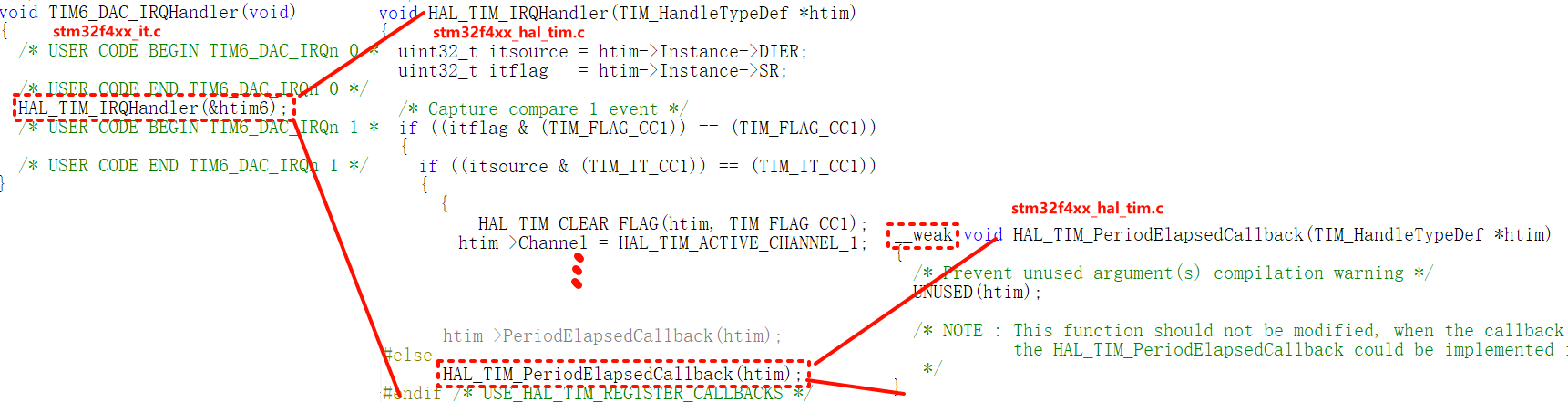 该函数均调用HAL库的定时器中断统一处理函数HAL_TIM_IRQHandler(),该函数通过一系列的判断最终得出基本定时器目的为周期回调 (注释4),因此最终调用周期回调函数HAL_TIM_PeriodElapsedCallback(),该函数为虚函数