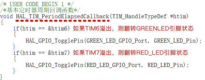 重新在tim.c中实现周期回调函数HAL_TIM_PeriodElapsedCallback(),当定时器TIM6溢出则翻转GREEN_LED引脚状态,当定时器TIM7溢出则翻转RED_LED引脚状态,具体代码如下图所示